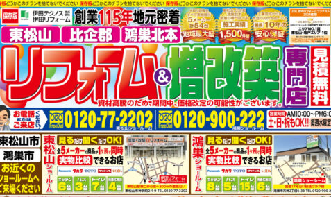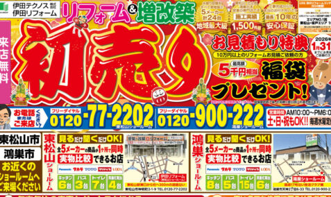 リフォームの春です!! 皆さま新生活いかがお過ごしでしょうか。 伊田リフォーム東松山店では、 3月28日(土)・29日(日)に 春のリフォーム大応援祭を実施致します。 この日だけの特典やお得な商品が目白押し! 皆様のご来場お待ちしております。