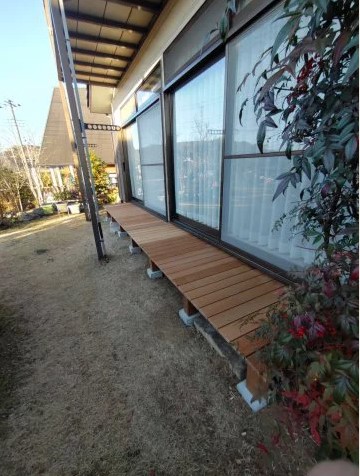 出幅が短いぬれ縁を広げ、お孫様にも安心して使えるようにしたいとお問合せ。今はやりの、樹脂製のものでなく木で作り上げたいとおしゃっておりました。耐水性の高いセランガンバツという密度の高い木材を使用して、大工さんに一から手作りしてもらいました。 お施主様もとても喜ばれ、いい年始が迎えられるとおっしゃってました。