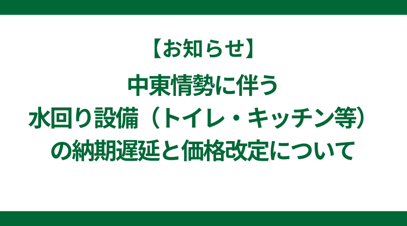 【重要】中東情勢に伴う「水回り設備(トイレ・キッチン等)」の納期遅延と価格 改定について(2026年4月20日更新)